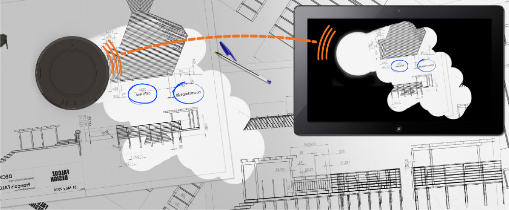 Ce palet a deux fonctions: partager une conversation à distance et partager des documents par scan. En glissant le palet sur les documents les personnes en conférence recevrons les images reconstituées.